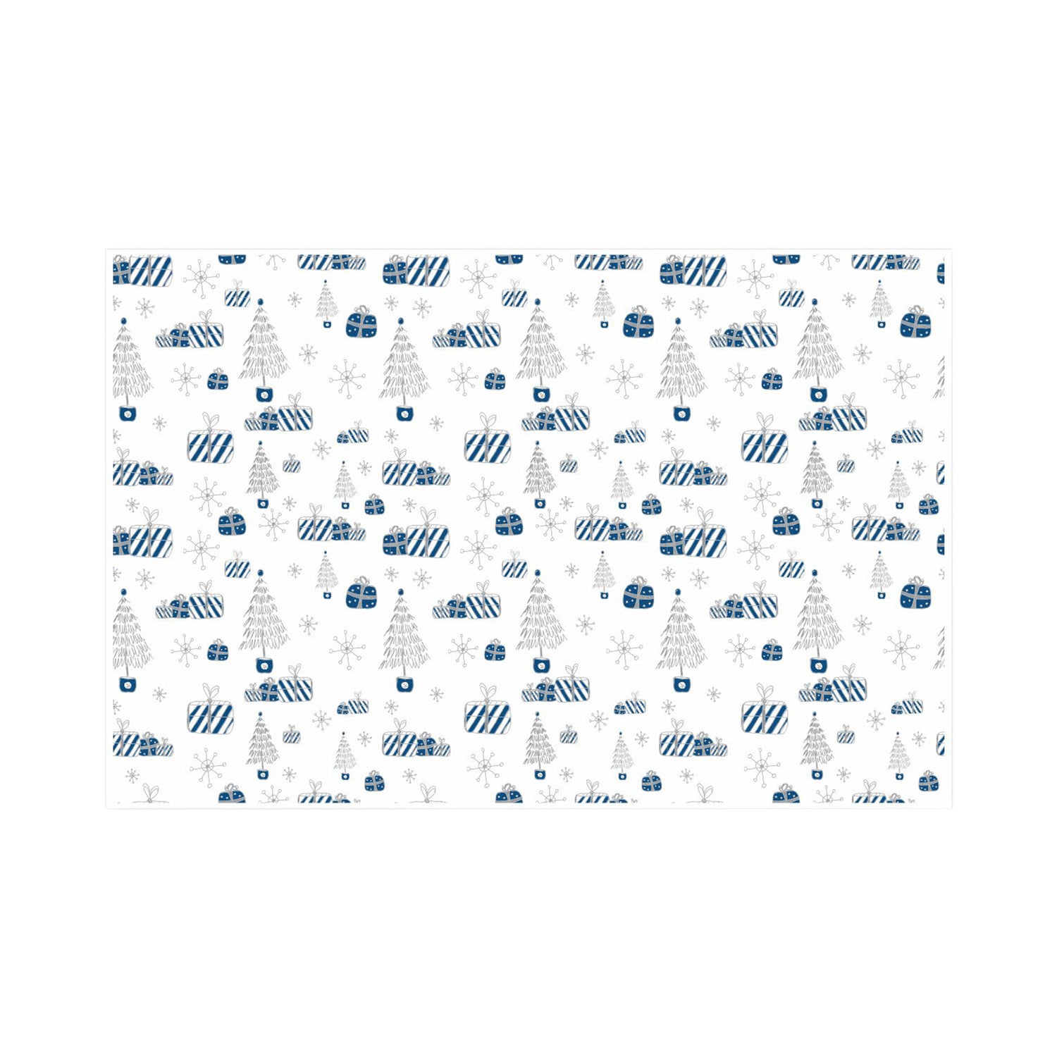 Tissue paper with blue presents, grey trees and snowflakes. A cool, elegant theme inspired by Nordic winter.