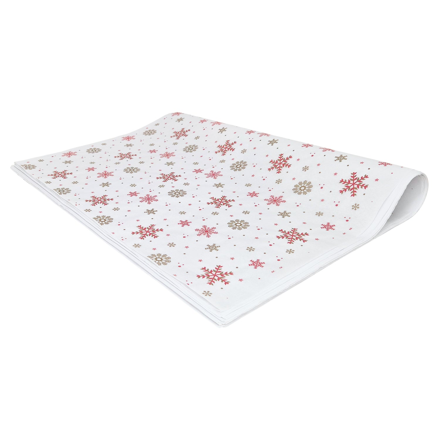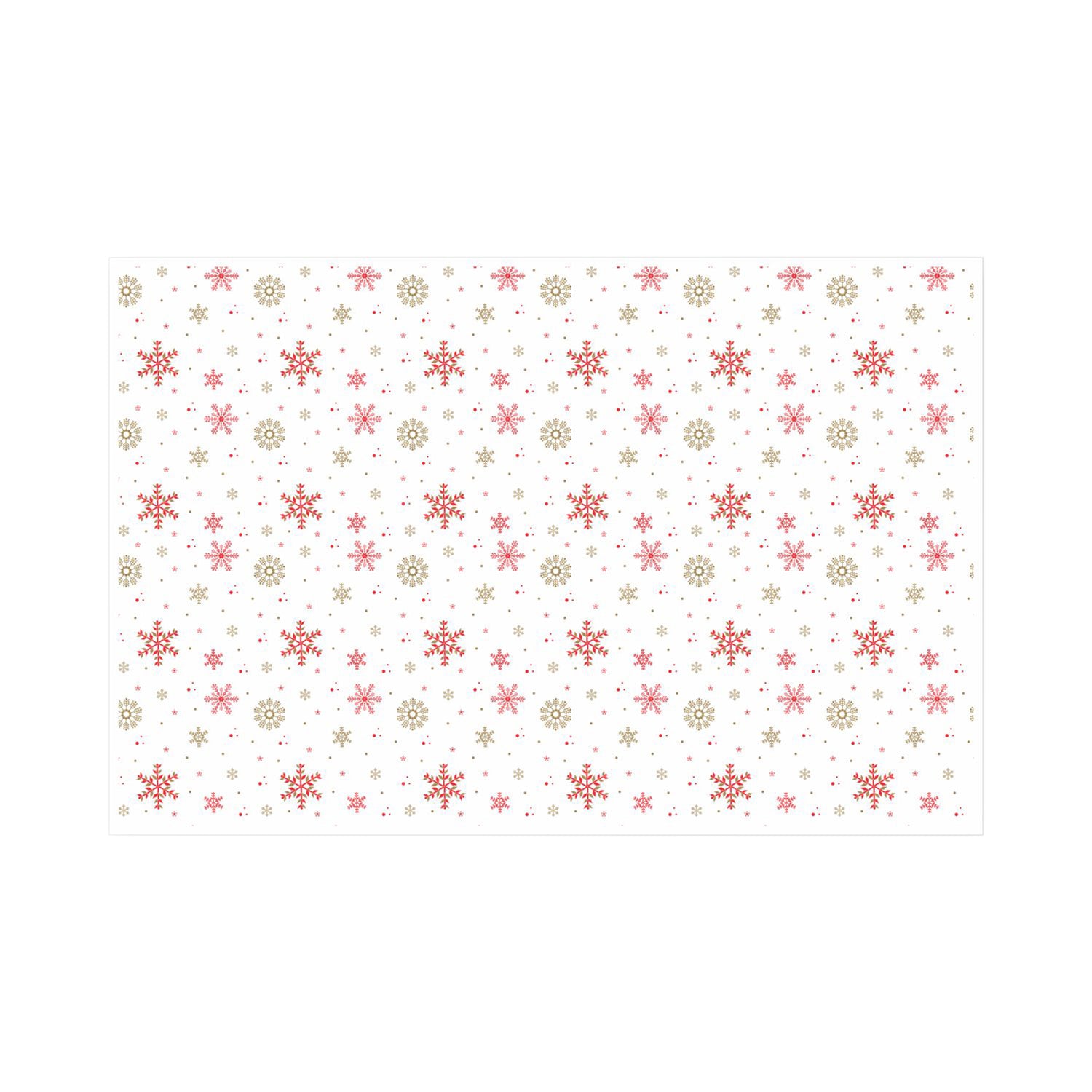 Tissue paper with red, golden and soft pink snowflakes, elegant and festive. Ideal for sophisticated gifts.