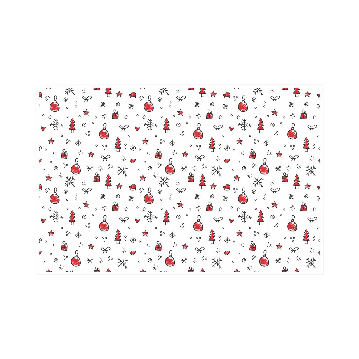 Tissue paper with red baubles, trees and gifts, combined with snowflakes and hearts. A joyful, energetic mix.
