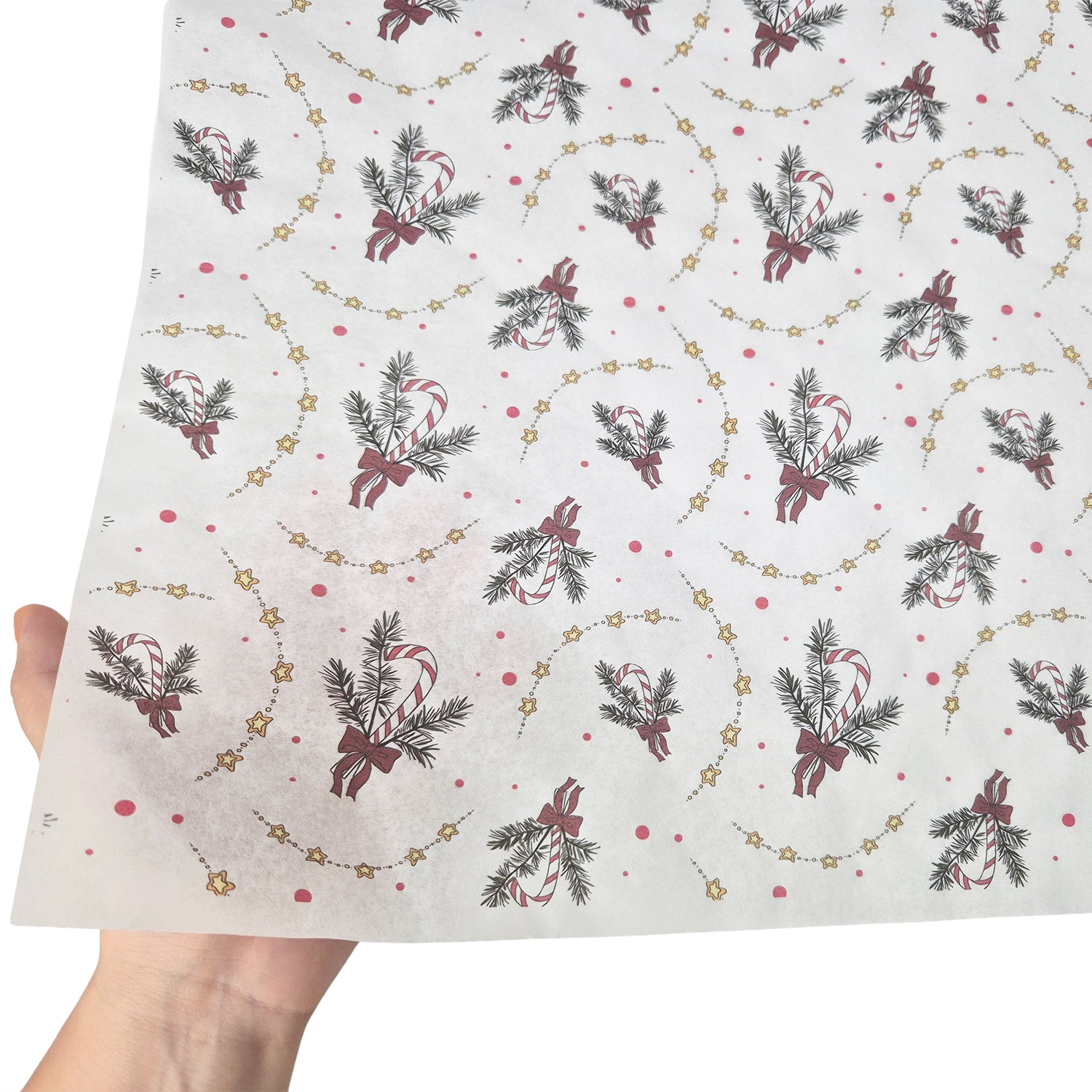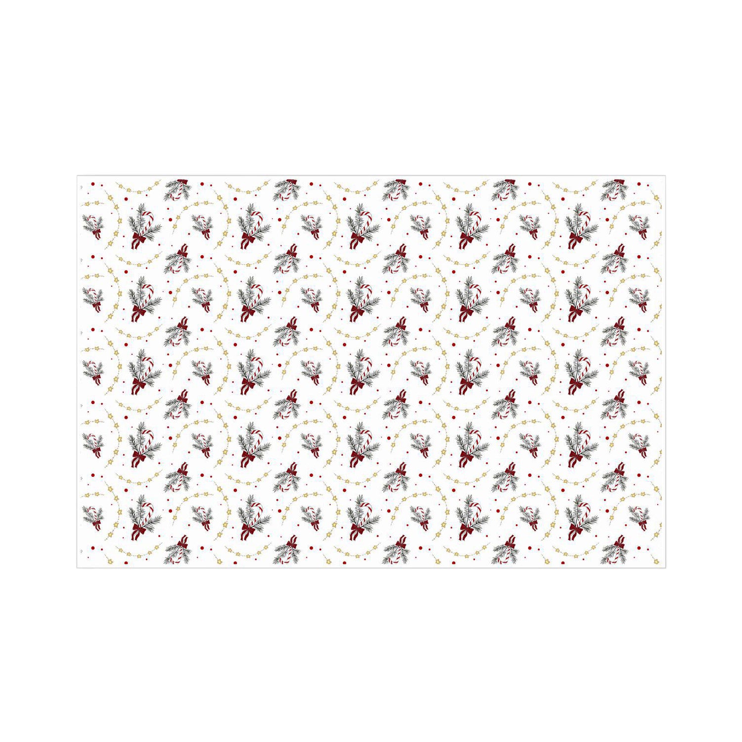 Tissue paper with candy canes, pine branches and red bows. A classic, sweet Christmas design.