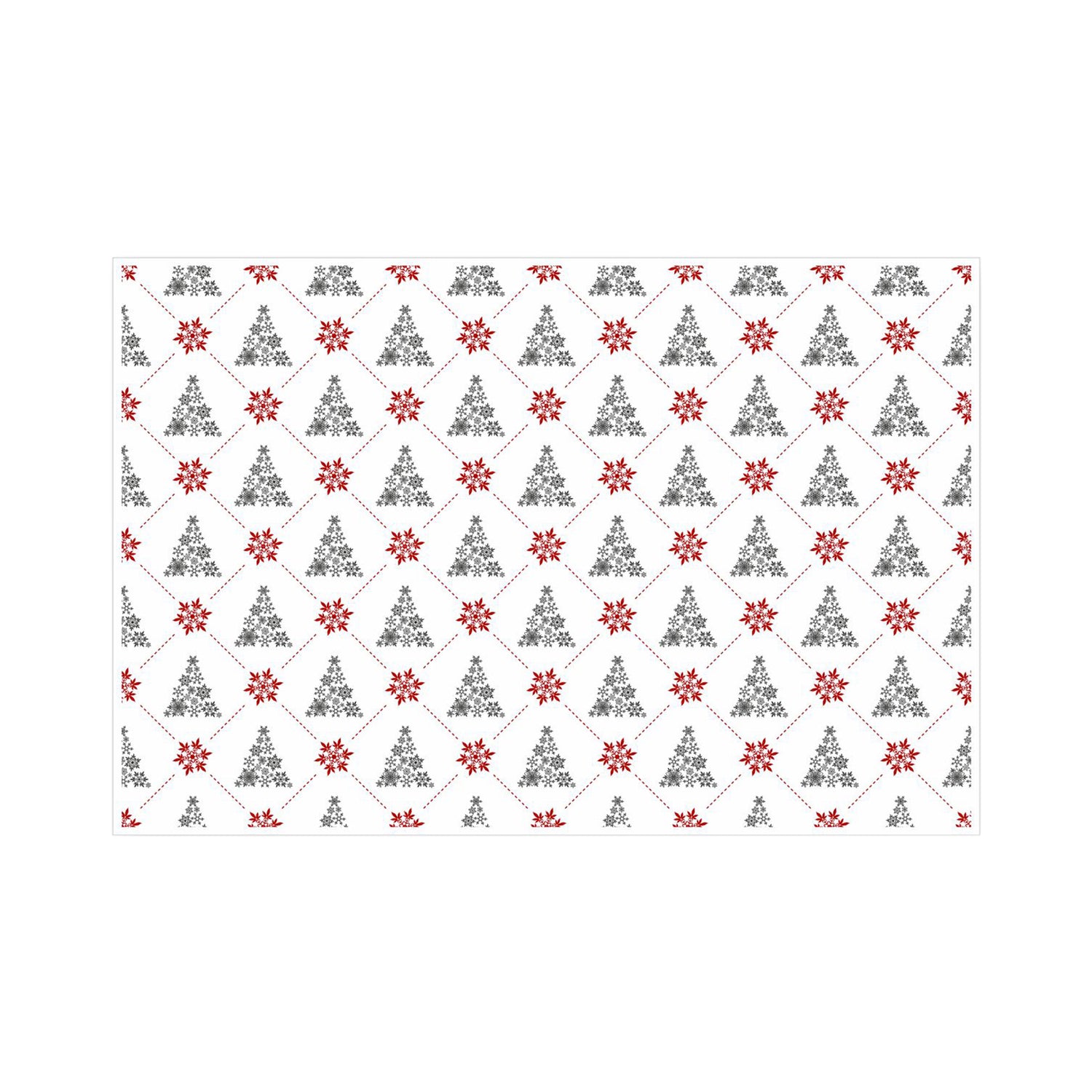 Tissue paper with green star-shaped trees and large red snowflakes, arranged geometrically. Perfect for striking packaging.