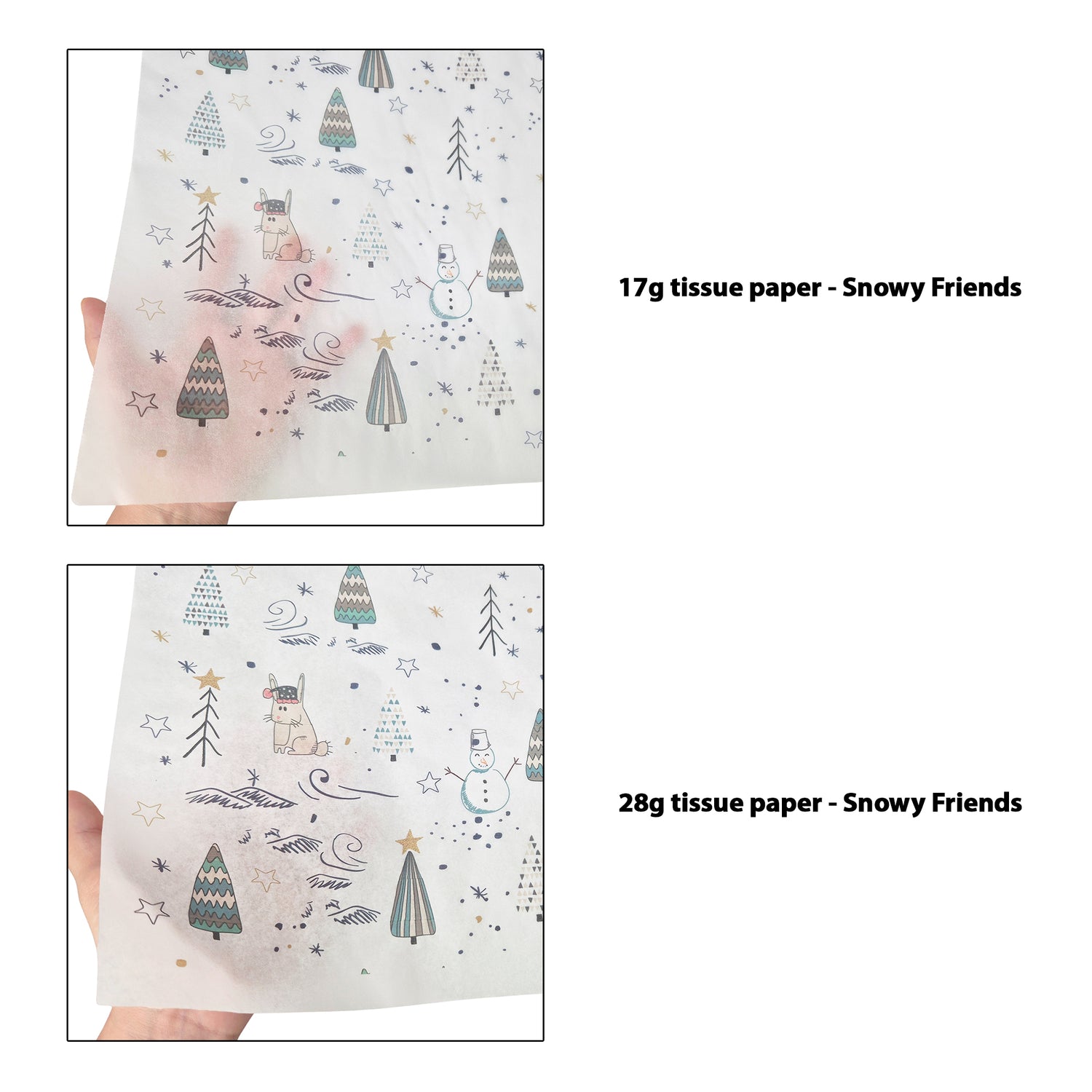 28gsm Snowy Friends Christmas tissue paper – 50x75cm format, ideal for joyful and themed gifts. In stock and ready for fast delivery across Europe.