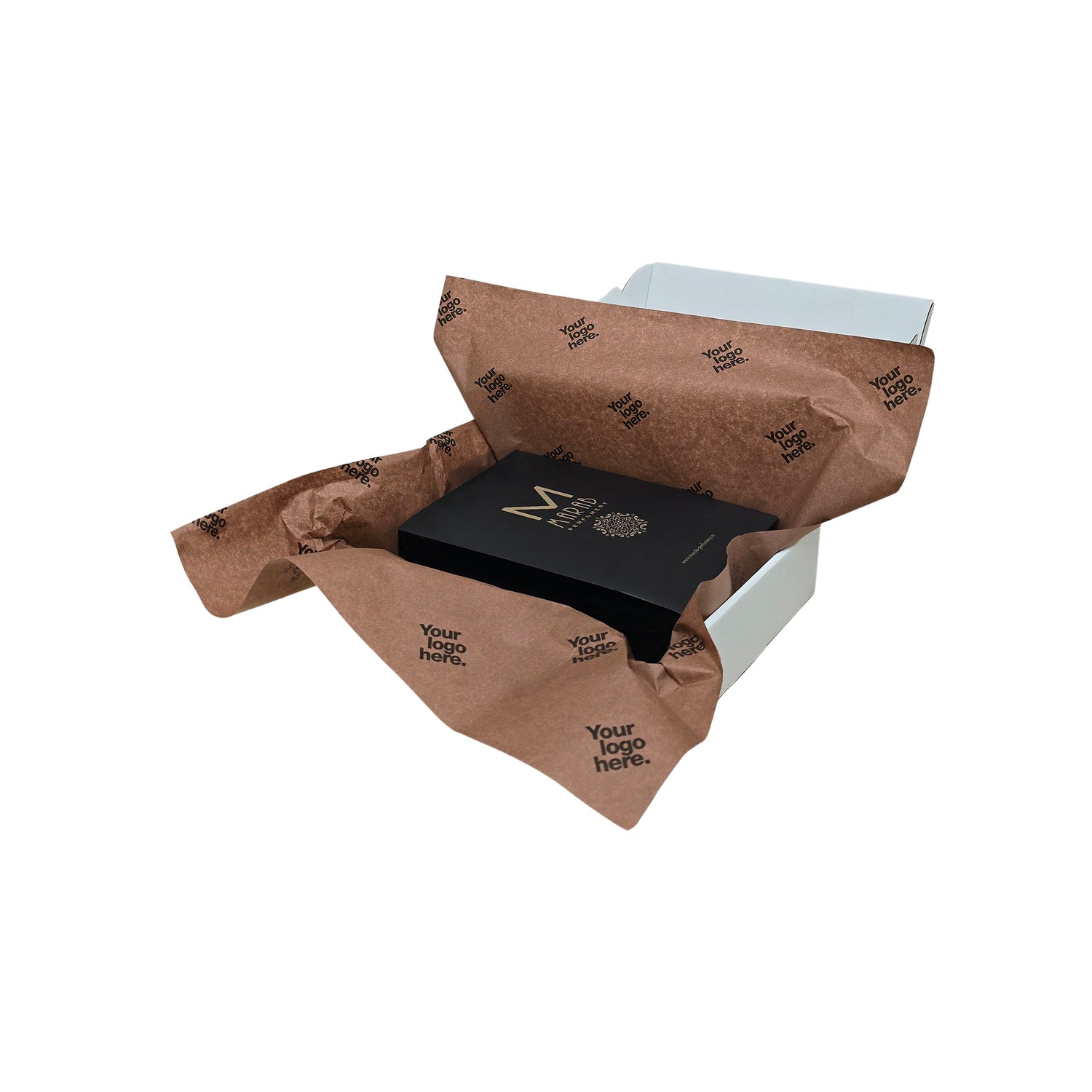 Brown 28g personalized tissue paper – 50x75cm format, ideal for premium packaging. In stock and ready for fast delivery across Europe.