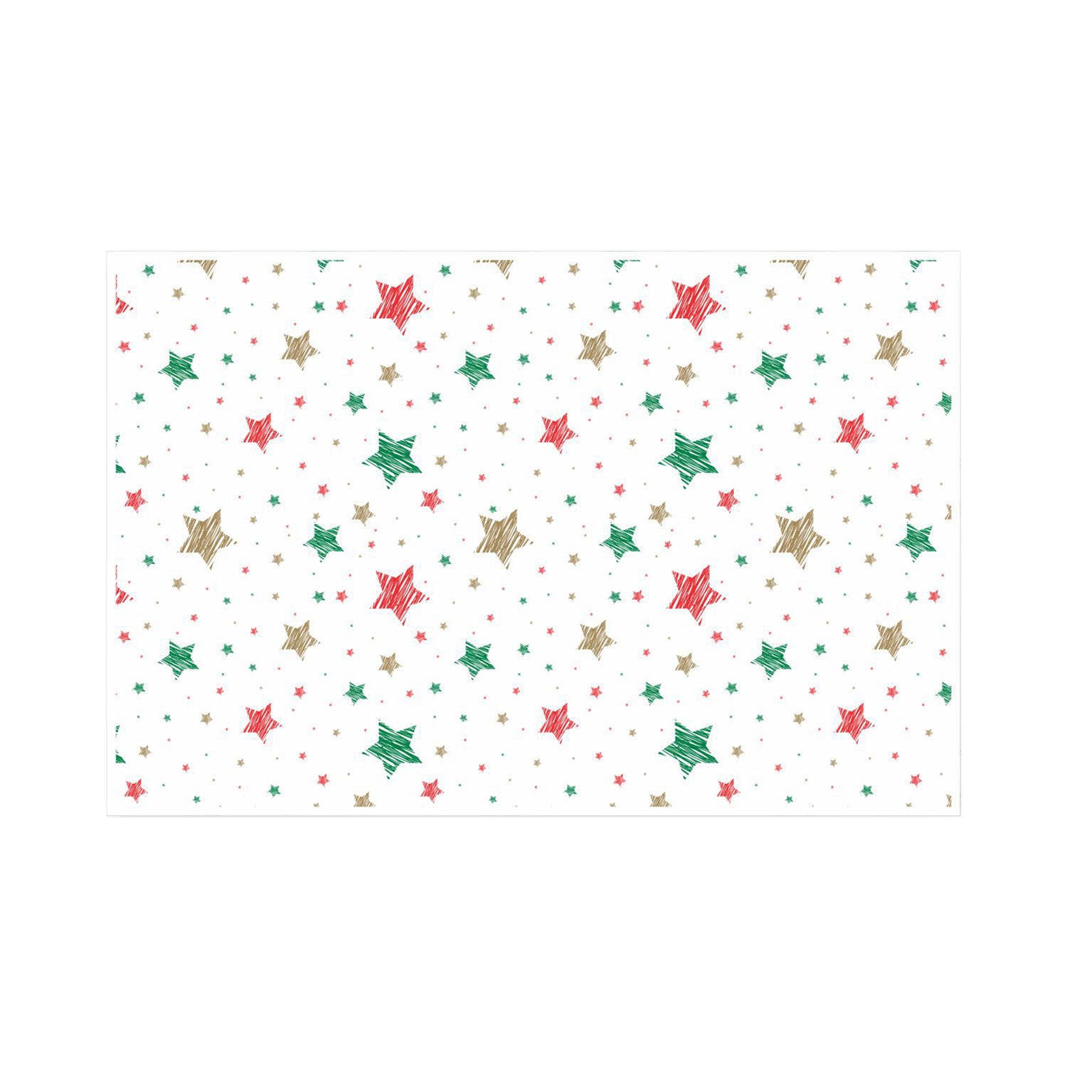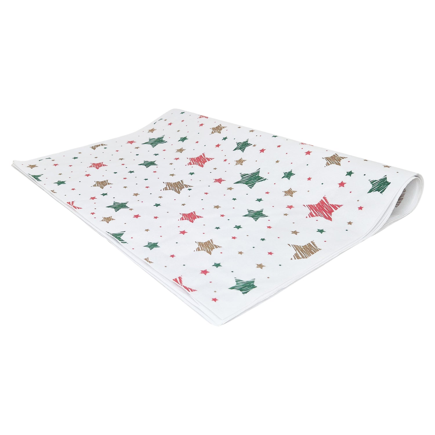 Tissue paper with hand-drawn green, red and golden stars. Perfect for cheerful gifts and holiday arrangements.